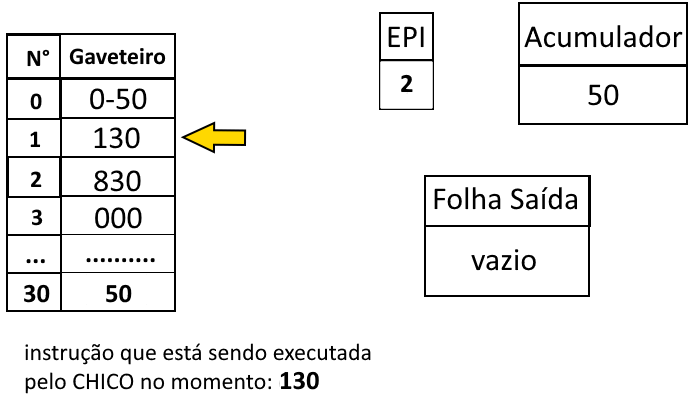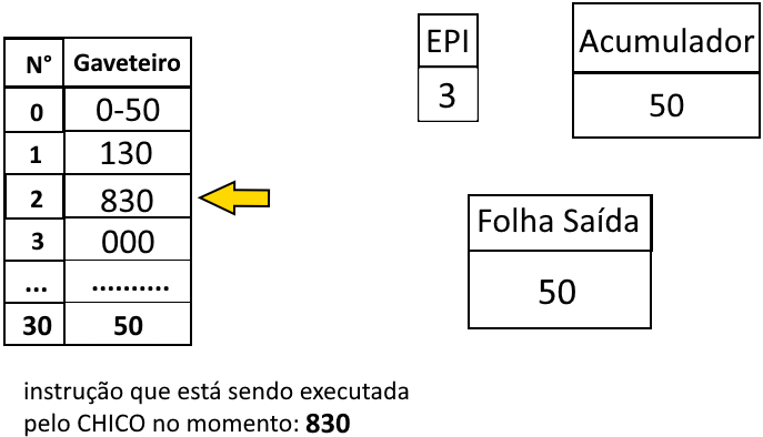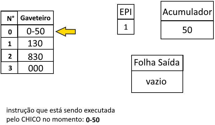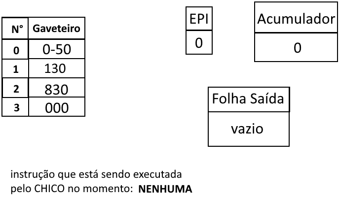 À fim de melhor demonstrar como o estado de execução funciona, a seguir há ilustrações do CHICO executando um programa que imprime 50 na folha de saída.