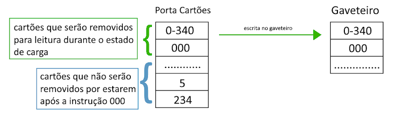 Durante o estado de carga as instruções que estão no porta-cartões são guardadas no gaveteiro, até que seja armazenado o cartão contendo a instrução 000, que indica o fim do estado de carga.